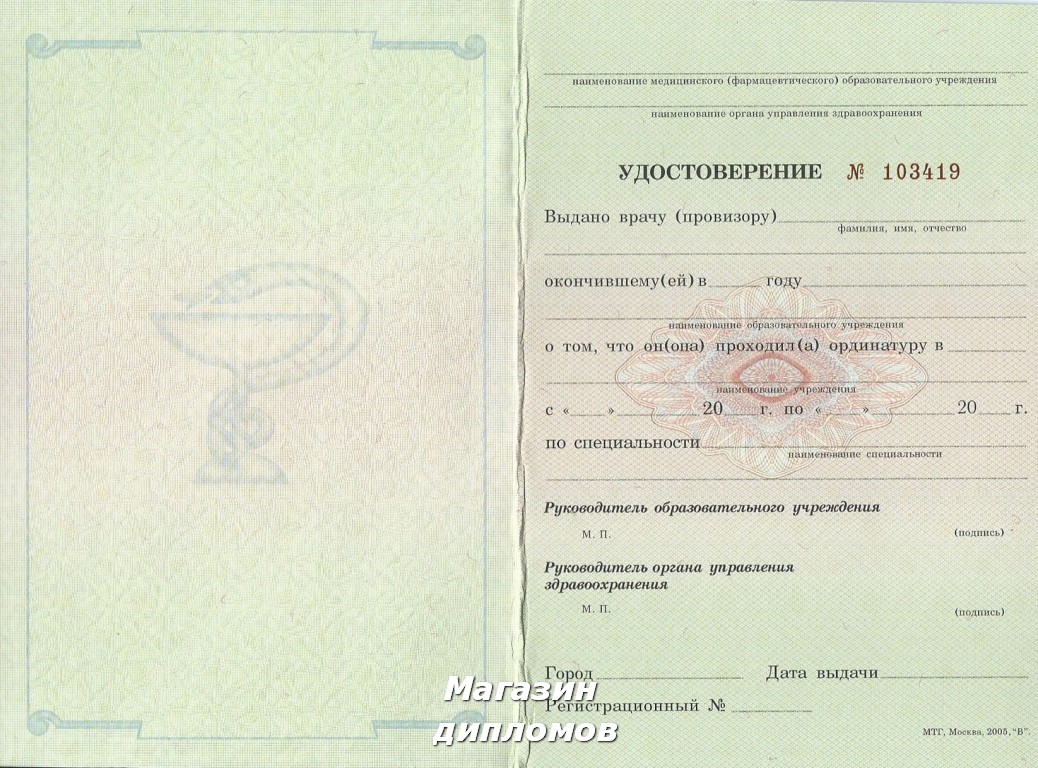 Удостоверение ординатуры Российской Федерации (Гознак, МТГ, Москва 2005 год.), выдавался с 2005 года.